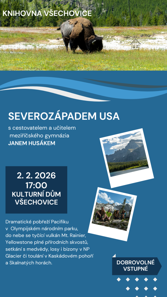 Příznivci cestování a poznávání různých koutů světa se sešli v pondělí 2. února 2026 v kulturním domě Všechovice. Své zážitky, fotografie a videa z cesty po severozápadní části USA jim přišel představit cestovatel Jan Husák.