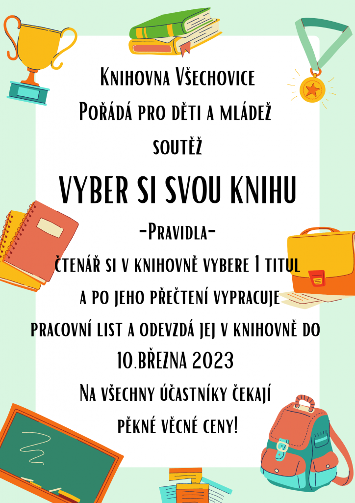 V období od 10. 1. 2023 do 10. 3. 2023 probíhala v naší knihovně akce pro děti a mládež "Vyber si svou knihu". Každý čtenář, který si v tomto období vypůjčil a přečetl nějakou knihu z knihovny, měl možnost vypracovat na základě přečtené knihy pracovní list, kterým se automaticky zařadil do soutěže